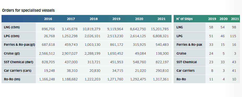 同時,去年除郵輪外的特種船市場表現十分活躍。2021年LNG船新船訂單量達到98艘1520萬立方米,其中12艘為LNG加注船。LPG船訂單量也達到了創(chuàng)紀錄的135艘。不銹鋼化學品船和汽車運輸訂單量均高于前幾年,而郵輪訂單幾乎消失。