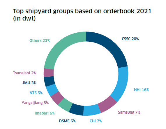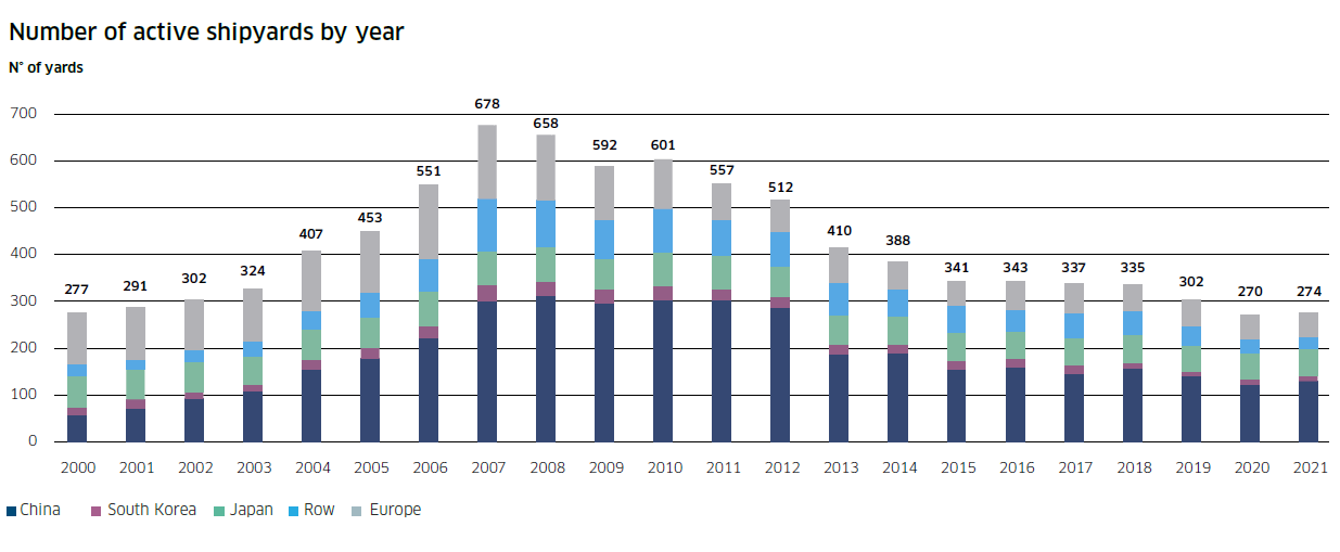 目前,全球活躍船廠(年內接獲新訂單和/或交付新船的船廠)數量為274家,比2020年增加了4家,但僅為2007年最高約700家的40%左右。截止2021年底,全球手持訂單量從2020年底的1.8億載重噸(2003年以來最低數字)增至2.23億載重噸。